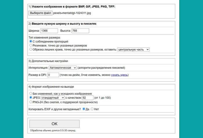 Для изменения размера «С соблюдением пропорций» можно указывать не только обе стороны (ширину и высоту), но и одну из этих сторон, например, ширину указать 1366 пикселей, а поле для ввода высоты можно оставить пустым или наоборот. Таким образом второй параметр автоматически подстроится под нужное значение.