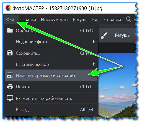 Для изменения размера открытого фото в «Фото-МАСТЕР» достаточно щелкнуть по инструменту «Файл/Изменить размер и сохранить» (см. скрин ниже 👇).