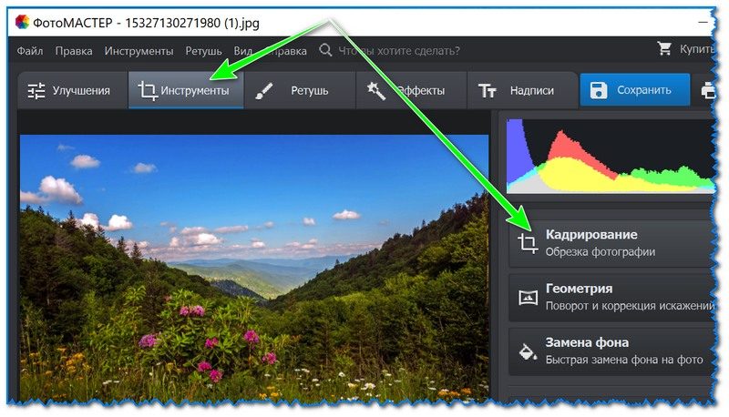 Эта операция также достаточно проста в «Фото-МАСТЕРЕ». Для начала щелкните по вкладке «Инструменты», а затем в меню справа выберите «Кадрирование».