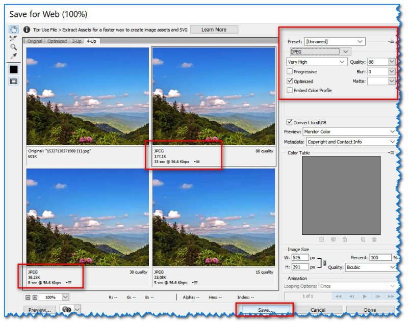 В Photoshop есть несколько вариантов сохранения картинки. Рекомендую обратить внимание на вариант «Save for Web» (сохранить для сети).