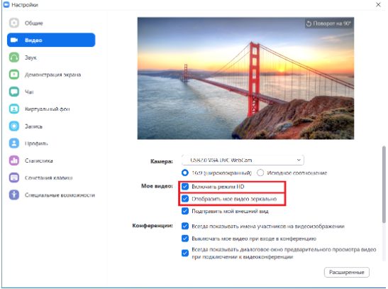 Если в конференции камера отображается неправильно, то ее следует перевернуть. Для этого предусмотрена специальная опция в настройках. Там же можно включить или отключить эффект зеркала, если он необходим или, наоборот, мешается.