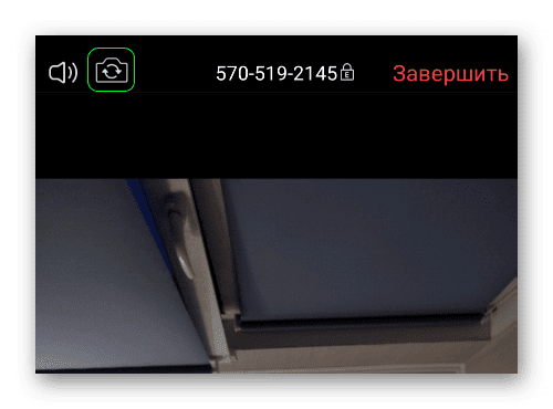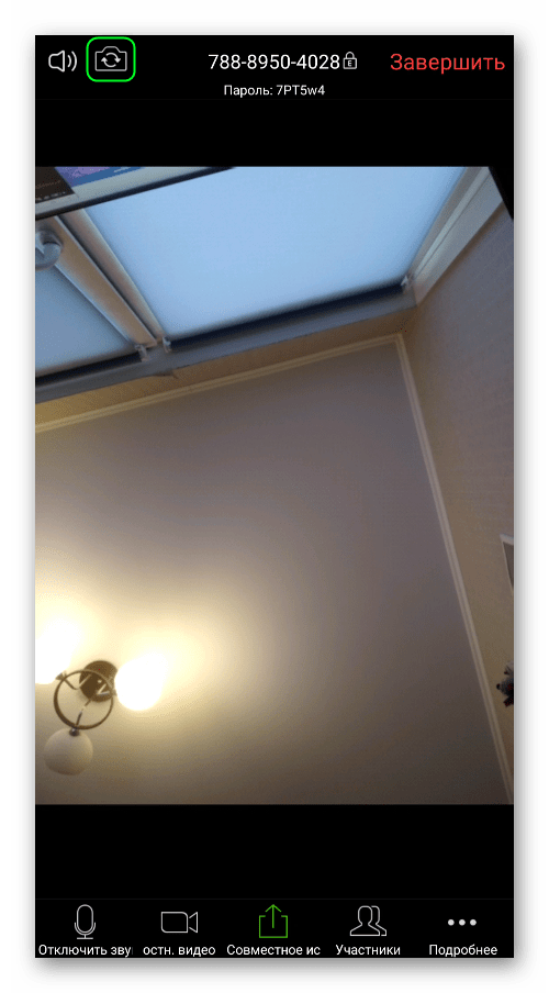 В мобильном приложении такая возможность отсутствует, но в нем можно сменить вид с фронтальной камеры (передней) на заднюю. Чтобы сделать это, перейдите к главному окну конференции, тапните по экране, чтобы вызвать элементы управления, и нажмите на выделенную иконку в верхней части экрана: