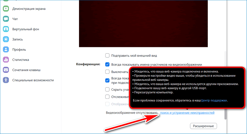 В Зоом есть встроенная помощь, которая пригодится при отсутствии видео. Для доступа к инструкции откройте раздел «Видео», прокрутите список опций вниз и нажмите на строку «Поиск и устранение неисправностей». Следуйте советам, если ничего не помогло, обратитесь в службу поддержки.
