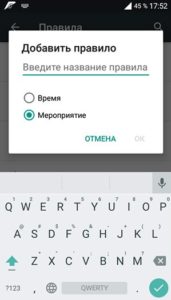 Для этого выбираем в правилах стандартную вкладку «Время», затем жмем «Мероприятия». Источником таких событий выступать может имеющийся на гаджете календарь с отмеченным событием.