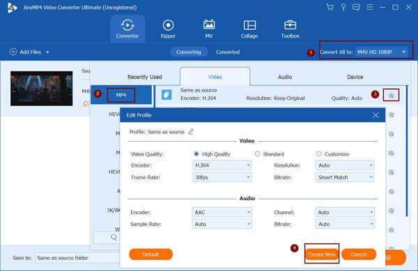 Нажмите Конвертировать все в меню для выбора формата MP4 в списке видео. Чтобы сохранить высокое качество, вы можете выбрать Так же, как источник возможность сохранить исходное разрешение. Затем вы можете щелкнуть Пользовательский профиль значок для изменения подробных параметров.