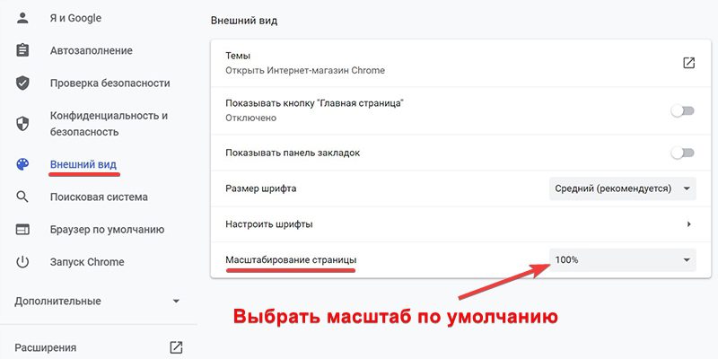 Слева выберите раздел «Внешний вид» и в правом окне установите требуемый масштаб по умолчанию для всех сайтов. Ниже также можете изменить размер и сам шрифт по умолчанию.
