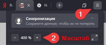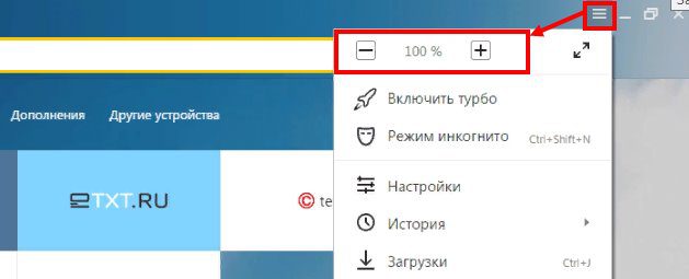 Откройте меню браузера « ≡ » (правый верхний угол вашего браузера) и в строке «Масштаб» измените масштаб нажимая на «+» (увеличить масштаб) или «—» (уменьшить масштаб).