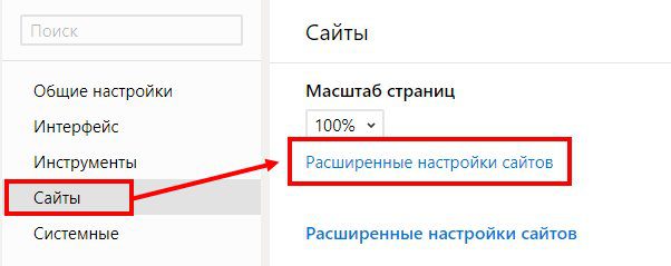 Далее вы попадаете в настройки браузера, где вам необходимо прокрутить правую область до раздела «САЙТЫ». Либо выбрать слева раздел «Сайты» и вы сразу попадете в данный раздел.