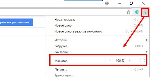 Откройте настройки браузера « ⋮ » в правом верхнем углу и в строке «Масштаб» измените масштаб нажимая на «+» (увеличить масштаб) или «—» (уменьшить масштаб).