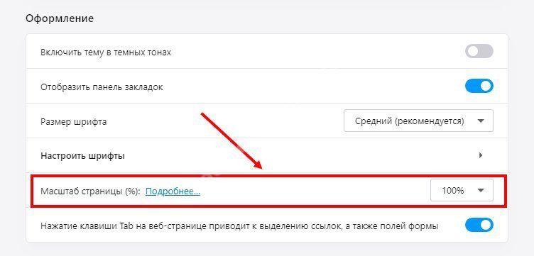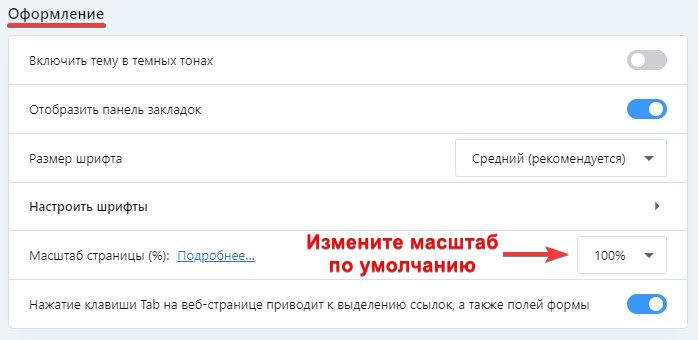 Прокрутите до раздела «Оформление» и установите требуемый масштаб по умолчанию для всех сайтов.