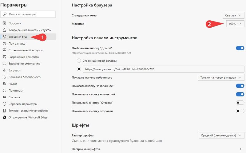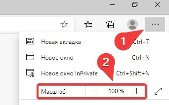 Откройте Параметры и прочее «⋯» (ALT + F) в правом верхнем углу браузера и установите необходимый масштаб страницы в строке «Масштаб». Нажимая на «+» и «—» установите новый масштаб страницы.