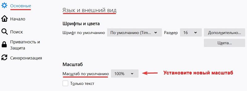 В разделе «Основные» прокрутите до пункта «Язык и внешний вид». Установите необходимый масштаб по умолчанию для всех сайтов. Установив чекбокс «Только текст» , масштаб изменится только для текста. Закройте данную вкладку (about:preferences) — все изменения будут сохранены автоматически.